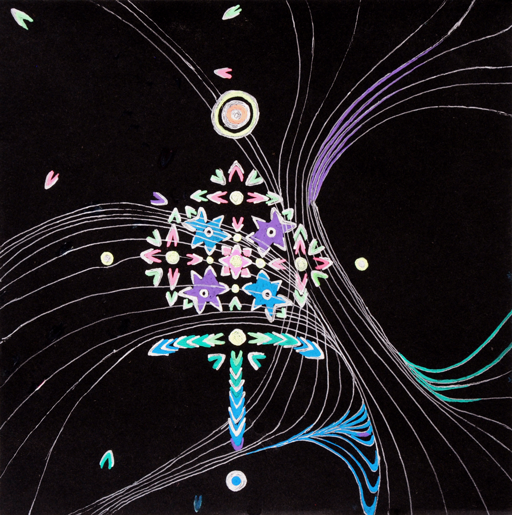 Gel pens on black paper, 6″ x 6″, 2019